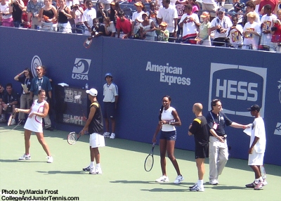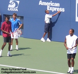 Today was the Ninth Annual Arthur Ashe Kids Day. Lots of money was raised, especially for the charity that was so important to Arthur Ashe -- the National Junior Tennis League (NJTL). Among those in today's show was fifteen year old Donald Young, a participant in that program who turned professional last fall. Though the stadium show did not draw as large a crowd as usual (tickets were actually handed out for no charge at the last minute), there was still a lot of excitement in the air as co-hosts JoAnna Garcia of the WB show Reba and MTV VJ Quddus led a presentation of tennis and music. Singers JoJo, Gavin DeGraw and Cherie performed their hits. Tennis exhibitions -- including the yearly American Express Challenge which raised money for the favorite charities of the players -- included Andy Roddick, Andre Agassi, James Blake, Serena & Venus Williams, Mike & Bob Bryan, Mardy Fish and Jennifer Capriati. Steffi Graf made a rare appearance and played a match with Olympic Skier Bode Miller. There was even a mixed doubles match between six of the tournament's wildcard entries. Future stars Rajeev Ram, Alex Kuznetsov and Donald Young faced off against up and coming players Amber Liu, Jessica Kirkland and Jamea Jackson. Admission was free throughout the grounds (the only charge was for the Stadium show) for sponsored activities such as Fidelity Temporary Tattoos, Hess Get Pumped Up, Z100 Party Patrol, NIKE GoTennis, Lincoln Navigate Your Shot, Barilla Challenge of Champions and Olypus Design To Win. Despite the lower attendance and some technical problems in the musical numbers, the show was still a hit with the audience and, most important, it raised money for some worthwhile causes. Hopefully this event will do even better next year.