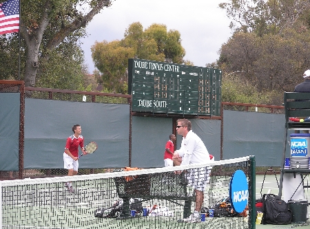 It was a "you had to be there" spectacular with the crowds overflowing the stairs, the balcony, and anywhere else they could find a spot. I was able to stay down by the courts and watch the action when -- at 2-1 Ohio State -- the Buckeyes shouted as Steve Moneke gave them a 3-1 lead. It wasn't long before the gap closed as Roger Gubser took one for Texas and all eyes followed the final two. Longhorn Travis Helgeson pulled the third set out from Bryan Koniecko to tie it all at 3-3 and it was all up to Dennis Mertens and Michael Reyes Valera, also in the third set. The semifinal berth was left to a third set tiebreaker. The Ohio State crowd cheered as Dennis had it up to 5-2, but as quickly as the lead came it was gone and Texas amazingly came back to win it 7-5.